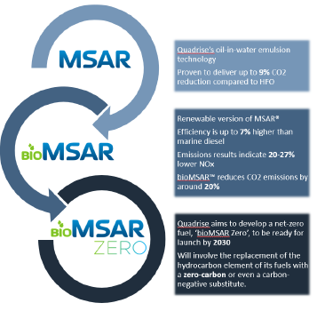 QED’s products demonstrably and quantifiably improve fuel efficiency through total combustion, thereby reducing nitrous oxide (NOx) emissions and soot (particulate emissions). bioMSAR which uses glycerine, builds on this by delivering a significant reduction (up to 25%) in carbon dioxide (CO2) emissions making it comparable to natural gas, which for many industries is the obvious transition fuel despite the high cost required to retrofit engines or supply LNG.
