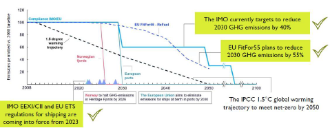 The marine industry is responsible for transporting 90% of world commerce and is almost entirely powered by heavy fuel oil (HFO) consuming in excess of 300mntpa, making the industry one of the most significant contributors to global GHGs. As a result, the International Maritime Organisation (IMO) has set a target to reduce CO2 emissions from the industry by 40% by 2030 and 70% by 2050.