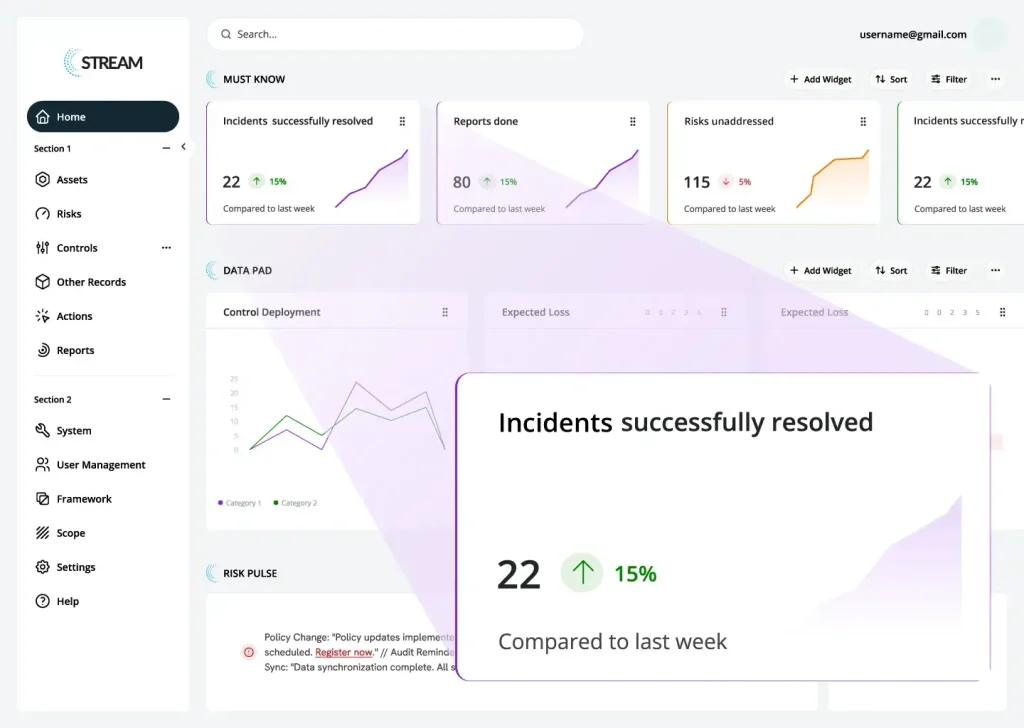STREAM® is our flagship GRC platform that unifies risk, compliance, and governance processes in a single, intuitive solution designed for the modern enterprise.