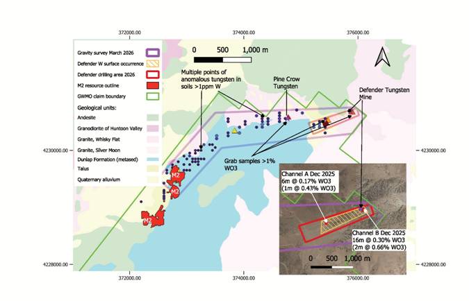 Following earlier positive field mapping and grab sampling, in December 2025 the Company undertook a machine-cut channel sampling programme at Defender. Two channels returned significant tungsten mineralisation, including 6 m at 0.17% WO₃, including 1 m at 0.43% WO₃, and 16 m at 0.30% WO₃, including 2 m at 0.66% WO₃ (see RNS dated 29 January 2026). Importantly, elements that could represent potential processing penalties were recorded at very low concentrations, and silver mineralisation was also intersected within Channel B.