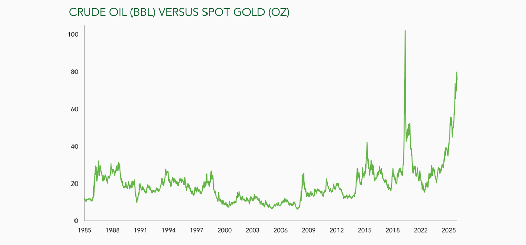 In its latest market commentary, Ruffer Investment Company highlights a growing dislocation between two key real assets: gold and oil. As inflationary pressures and geopolitical risks persist, gold has continued to attract capital, while oil prices have declined sharply. This unusual divergence has pushed the gold–oil ratio to extreme levels, prompting Ruffer to examine whether current market pricing reflects a structural shift or a short-term opportunity.