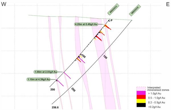 The Programme is progressing well and is over 90% complete, with thirteen holes (MBDD025-037) drilled and two holes left in the programme. The Company today reports the results from MBDD031 to MBDD033, which include a total of 23 mineralised intersections (Table 1; using a 0.20g/t Au cut-off grade).
