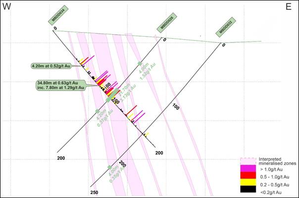 The Programme was completed at 2,982.80m in 15 holes (not including abandoned metres). The Company today reports the results from MBDD034 and MBDD035, which include a total of 22 mineralised intersections (Table 1; using a 0.20g/t Au cut-off grade). A review of the QAQC samples has confirmed that the data falls within acceptable limits of error.