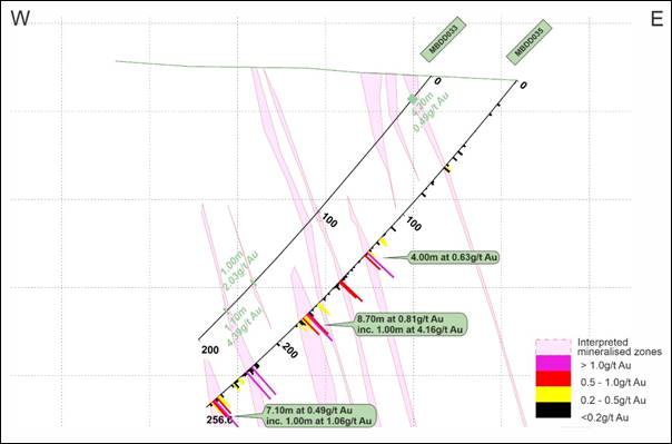 o Results from holes MBDD034 and MBDD035 have returned further gold intersections, including: