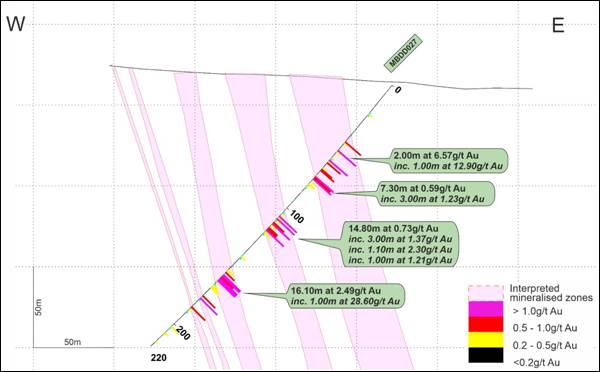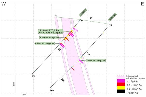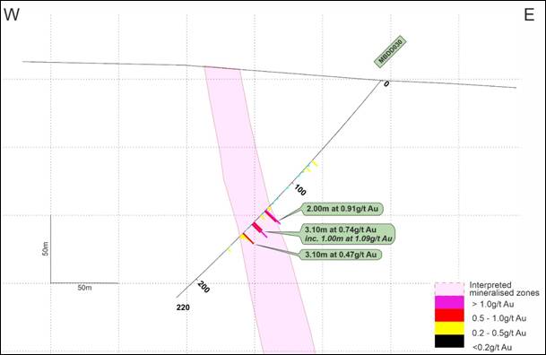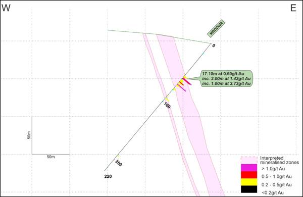 An additional wide zone of mineralisation was reported in hole MBDD028, located approximately 300m to the north of MBDD026. This correlates with intervals previously reported for hole MBDD025, 100m to the south of MBDD028, including 16.20m at 0.77g/t Au including 10.10m at 1.08g/t Au (see announcement dated 07 January 2026); again, this is likely to reflect the continuity of the mineralised structure between these holes.