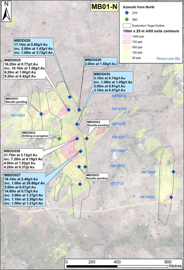 The Programme, which commenced in November 2025, has been planned to test the MB01-N target, which is located 700m to the northeast of the MB01-S deposit, where the Company has previously reported a maiden JORC Inferred Mineral Resource Estimate of 24.8Mt at a grade of 1.09g/t Au for 870,000oz contained gold (see announcement dated 21 October 2025).